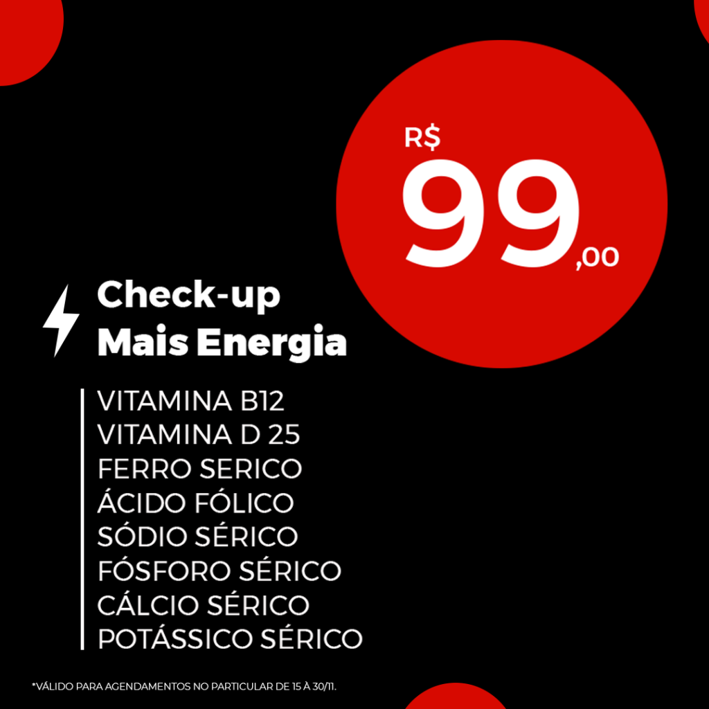 É indicado para pessoas que querem monitorar seu estado nutricional de forma personalizada e adequada. Auxilia no diagnóstico de possíveis deficiências de vitaminas e na causa de sintomas, como fadiga, queda de cabelo, unhas quebradiças, irritabilidade, pele seca, entre outros. Análise os seus níveis de vitaminas com o nosso check-up Mais Energia.